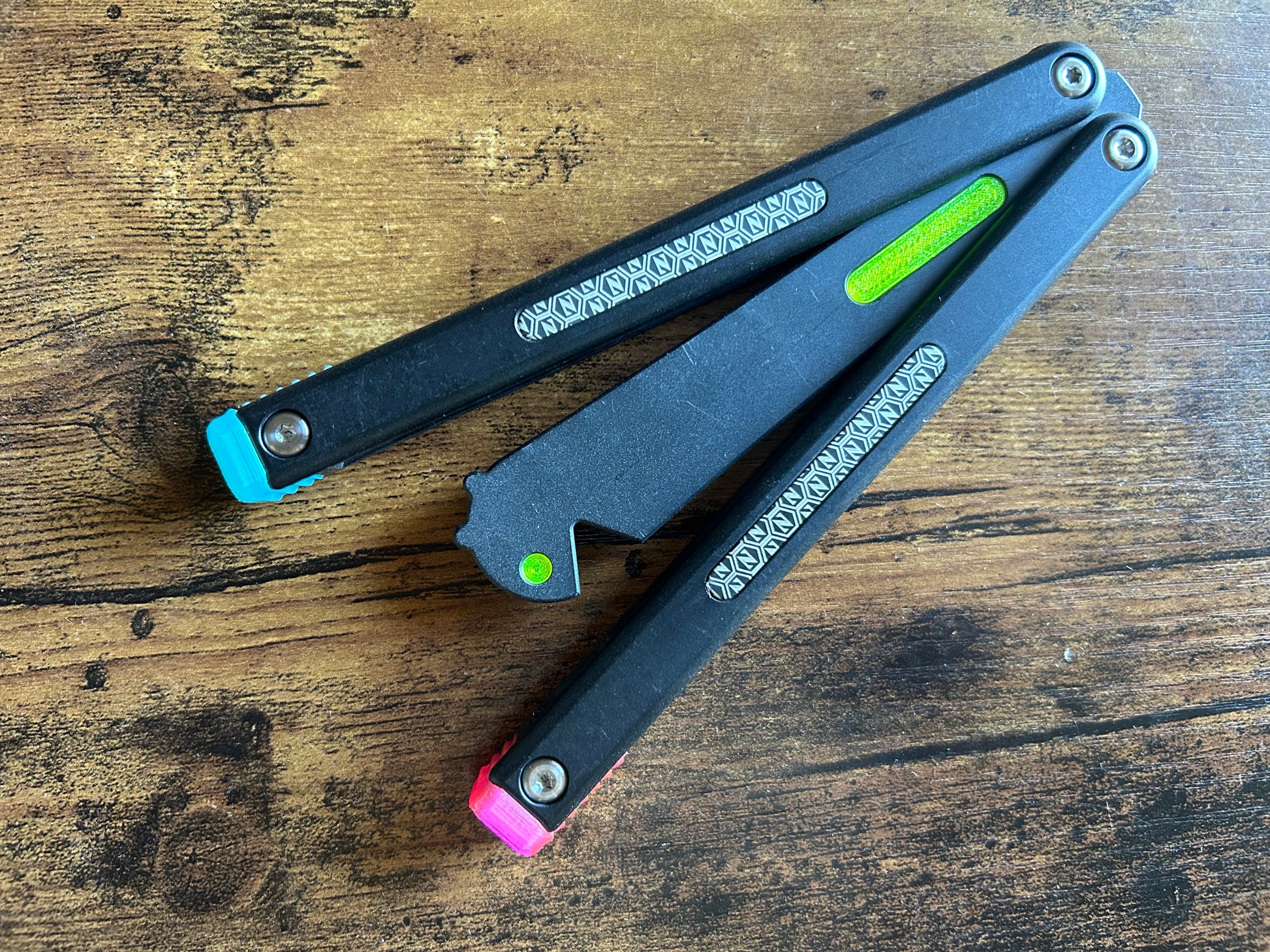 - Includes cosmetic blade inlays and handle extensions, increasing the Frank balisong handle length from 5.58" to 5.76".