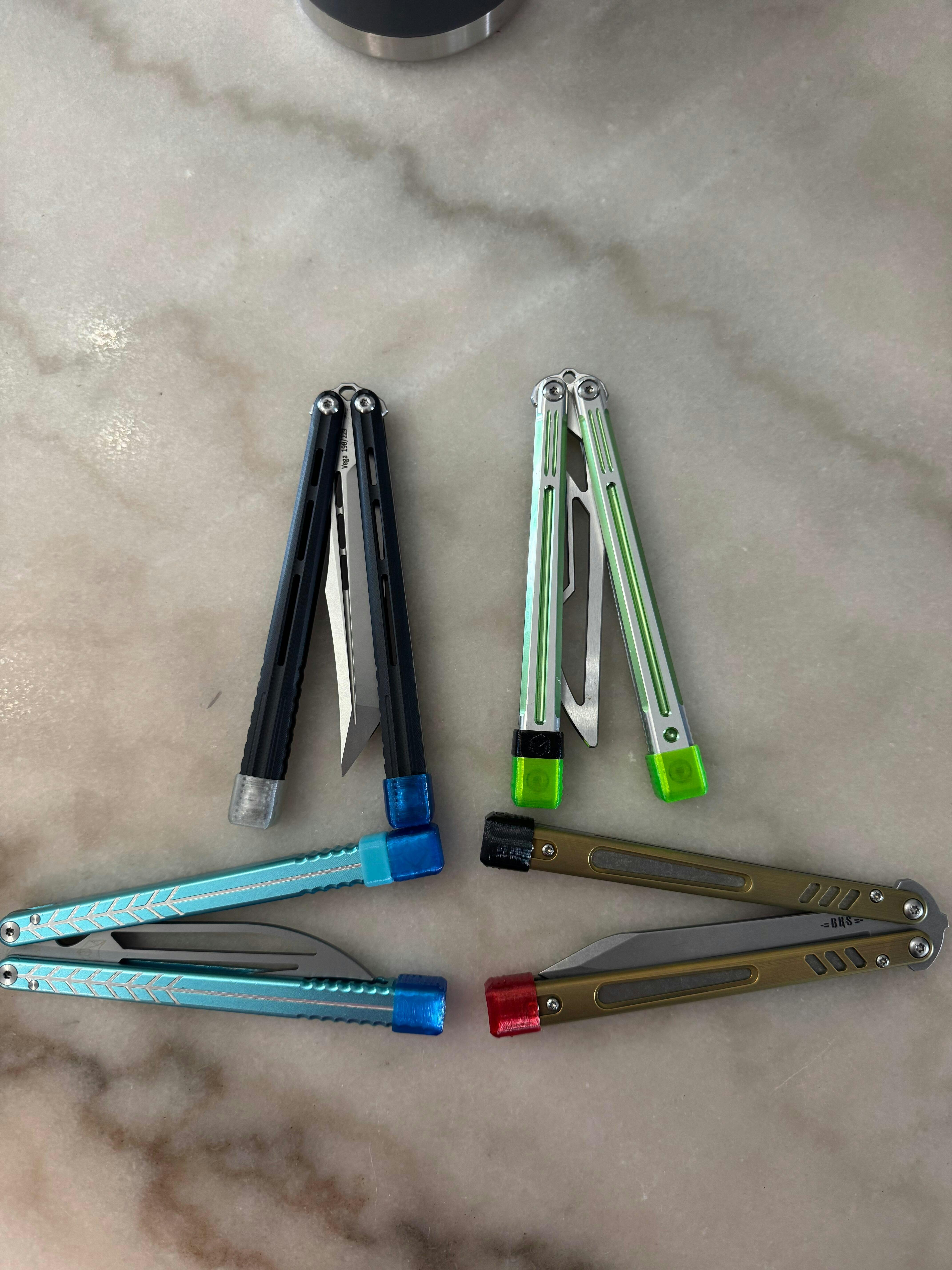 If your goal is solely to protect the handles of your balisong, these are the better choice compared to the weight caps: since the weight caps are designed primarily to work with Zippys, and the cap material is flexible and rubbery, there is always the risk that a tungsten weight contacts and "dings" the ends of your handles on a direct drop. Slim caps do not house removable Tungsten weights, and therefore offer the best handle protection (alongside weight caps with all the weights removed).